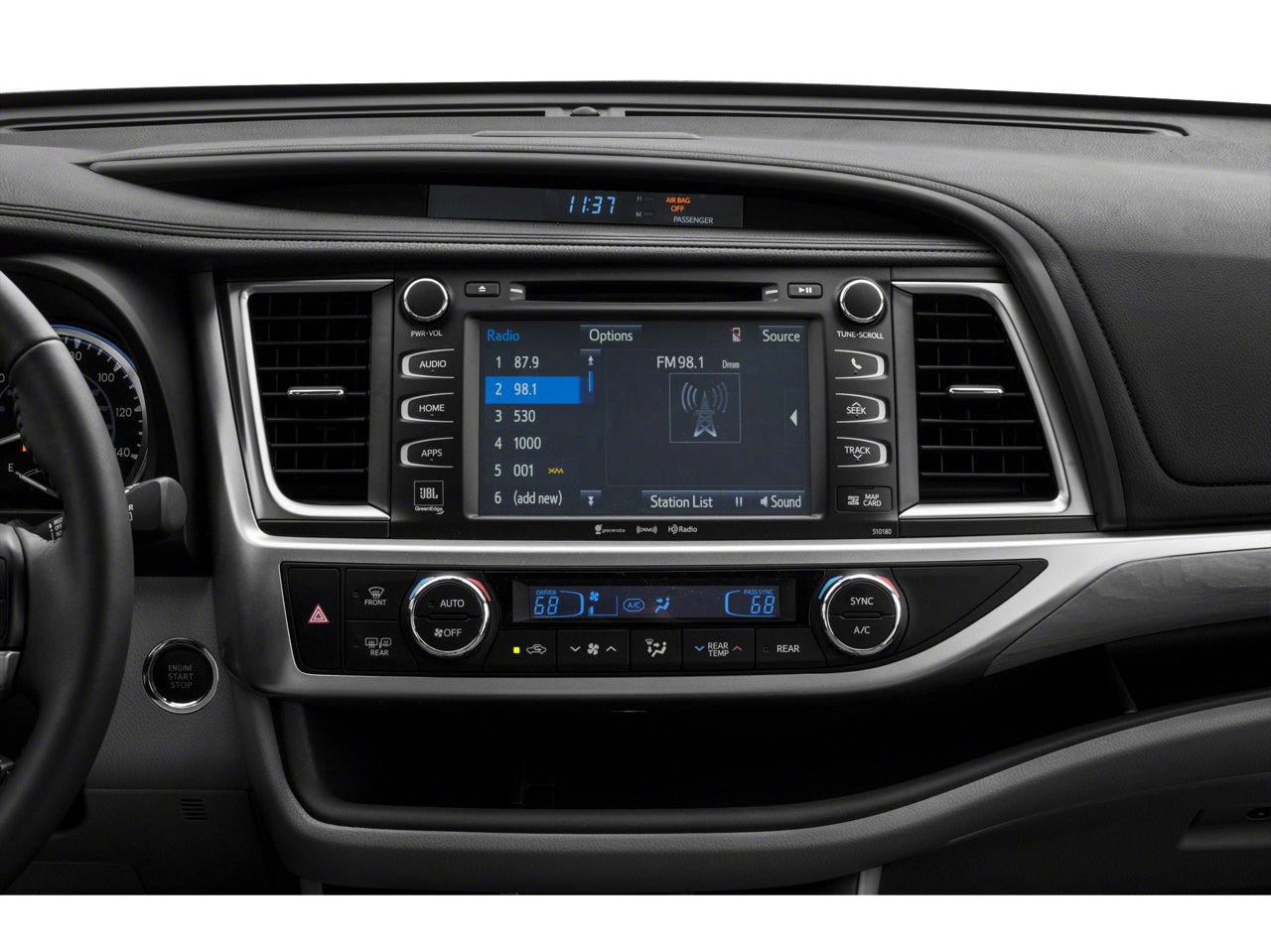 - Radio: Entune Premium JBL Audio w/Nav & App Suite -inc: the Entune Multimedia Bundle (8" high resolution touch-screen w/split screen display, AM/FM CD player, MP3/WMA playback capability, 12 JBL GreenEdge speakers, auxiliary audio jack, USB 2.0 port w/iPod connectivity and control, advanced voice recognition, hands-free phone capability, phone book access and music streaming via Bluetooth® wireless technology), Siri Eyes Free, Entune App Suite, Intelligent Touch controls, SiriusXM Satellite Radio w/3-month complimentary SiriusXM All Access trial, HD Radio, HD Radio predictive traffic and Doppler weather overlay, AM/FM cache radio, Gracenotes album cover art and integrated backup camera display w/dynamic gridlines